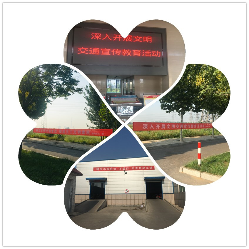 懸掛文明交通宣傳標(biāo)語,營造濃厚的宣傳氛圍。公司在廠區(qū)門口對面及存車棚外等懸掛文明交通宣傳教育標(biāo)語,使員工在上下班路上抬頭就可以看到醒目的標(biāo)語,特別是在存車棚處時(shí)刻提醒員工“騎車不闖紅燈、不逆行、不走機(jī)動車道”。通過懸掛標(biāo)語,營造了濃厚的文明交通宣傳教育氛圍。