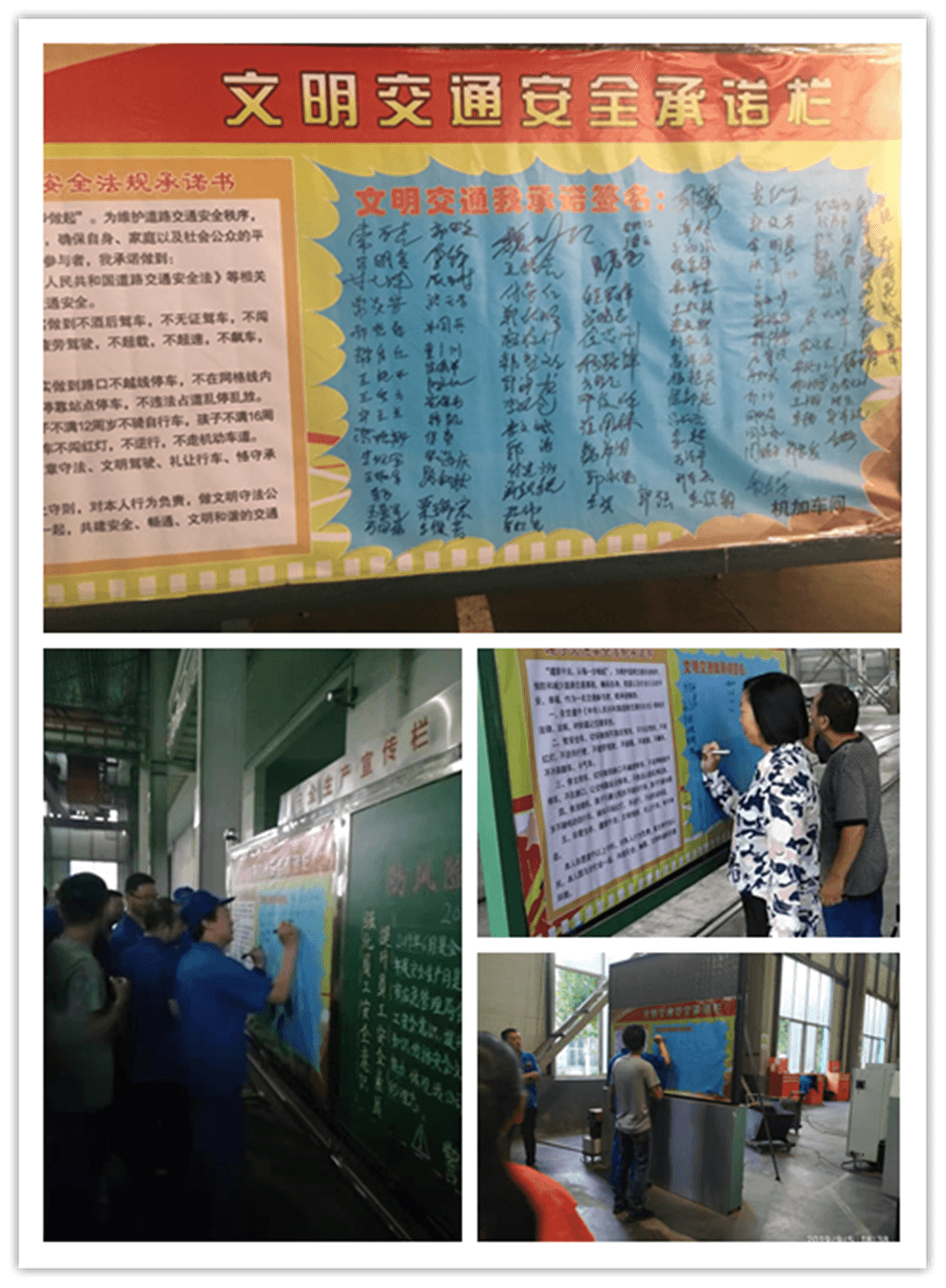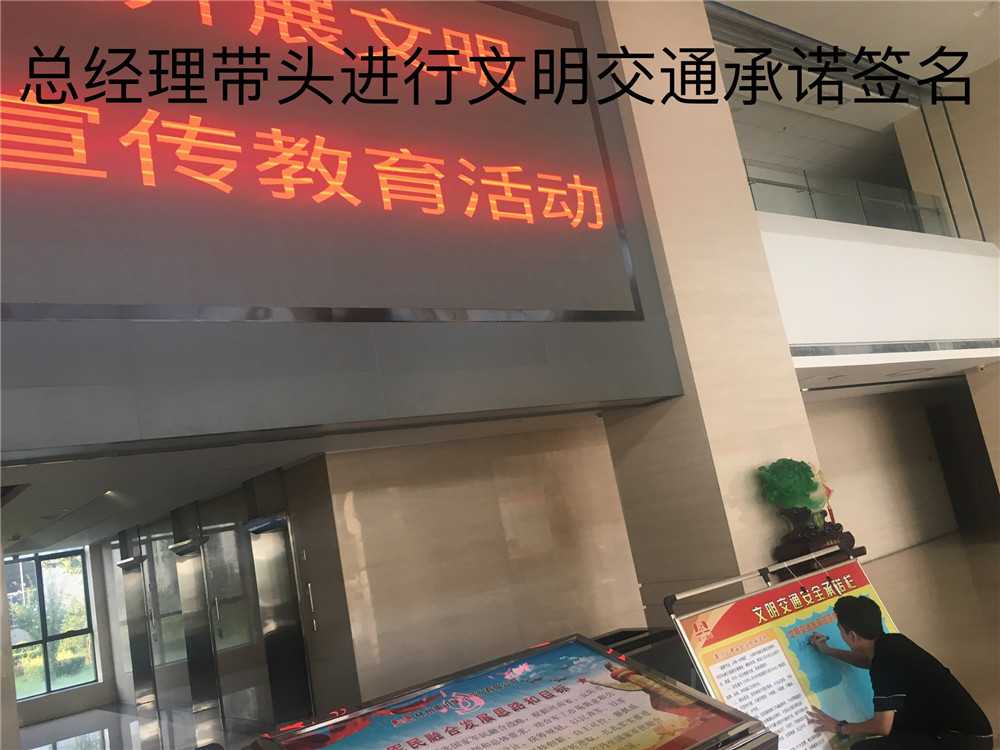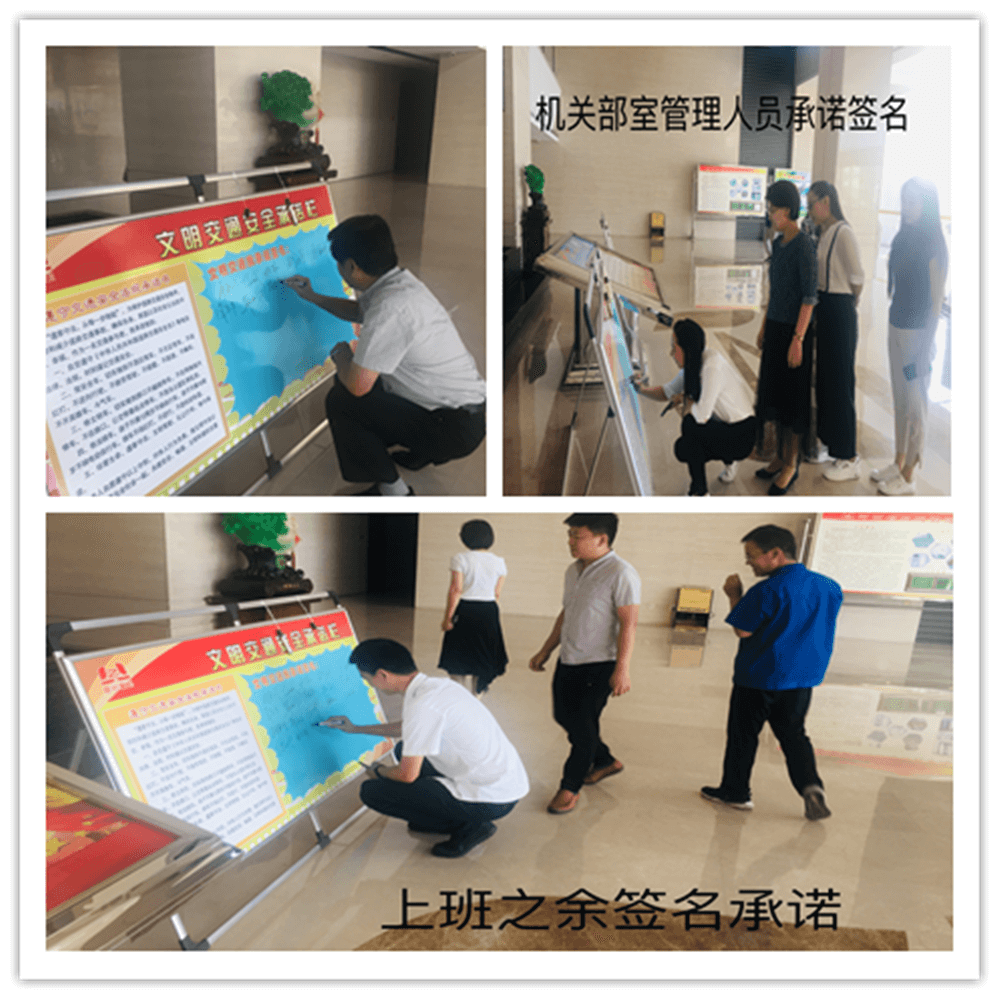簽訂“遵守交通安全法規(guī)承諾書”。公司制作了“遵守交通安全法規(guī)承諾欄”版面十余塊,擺放在醒目位置,以部門為單位,每位員工在版面上進(jìn)行簽名承諾。公司總經(jīng)理郭釧帶頭在《文明交通承諾欄》上簽名,其他領(lǐng)導(dǎo)和部門員工也陸續(xù)進(jìn)行了簽名,通過交通安全承諾簽名,使每位員工時(shí)刻提醒自己,履行自己承諾。
